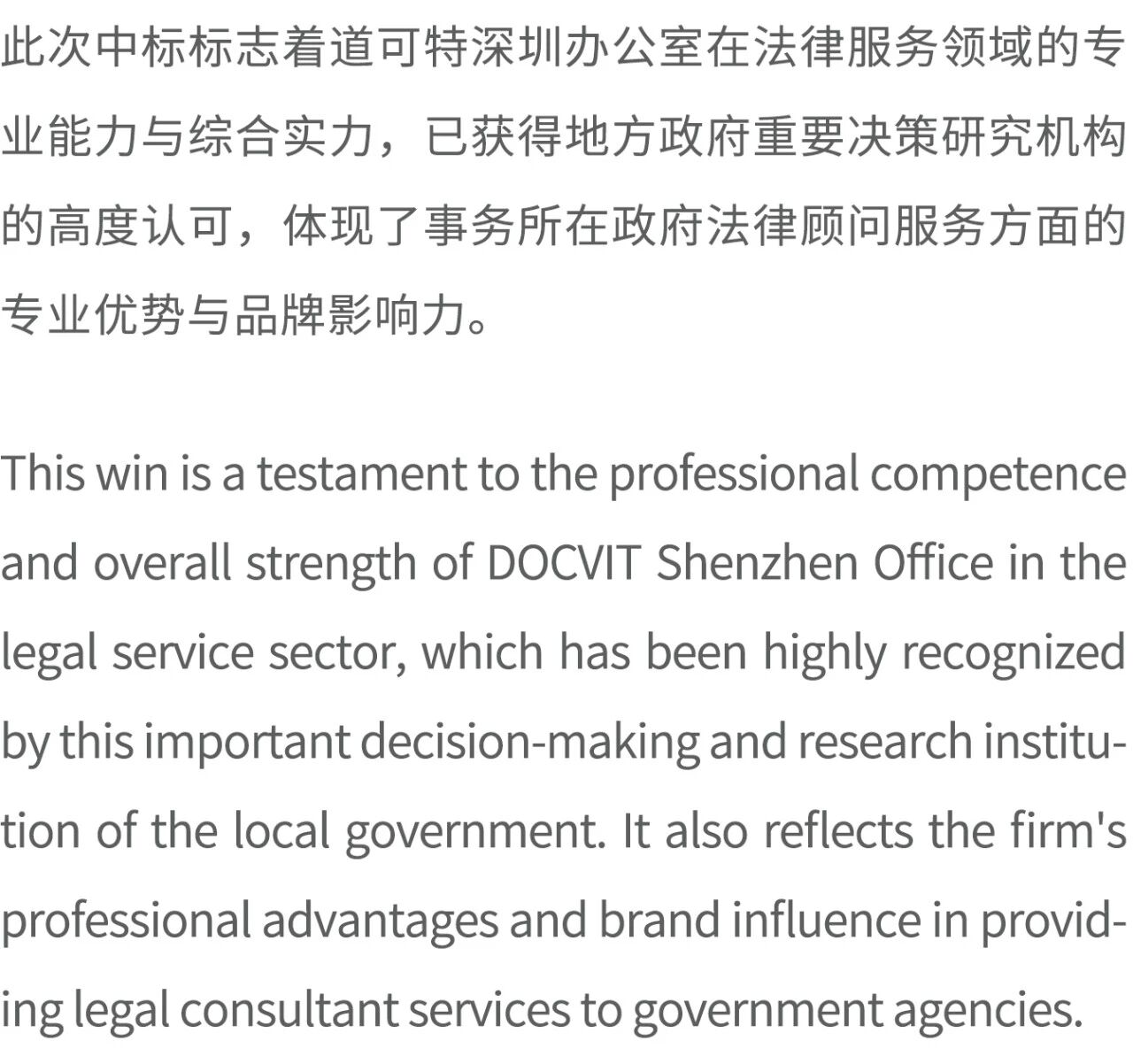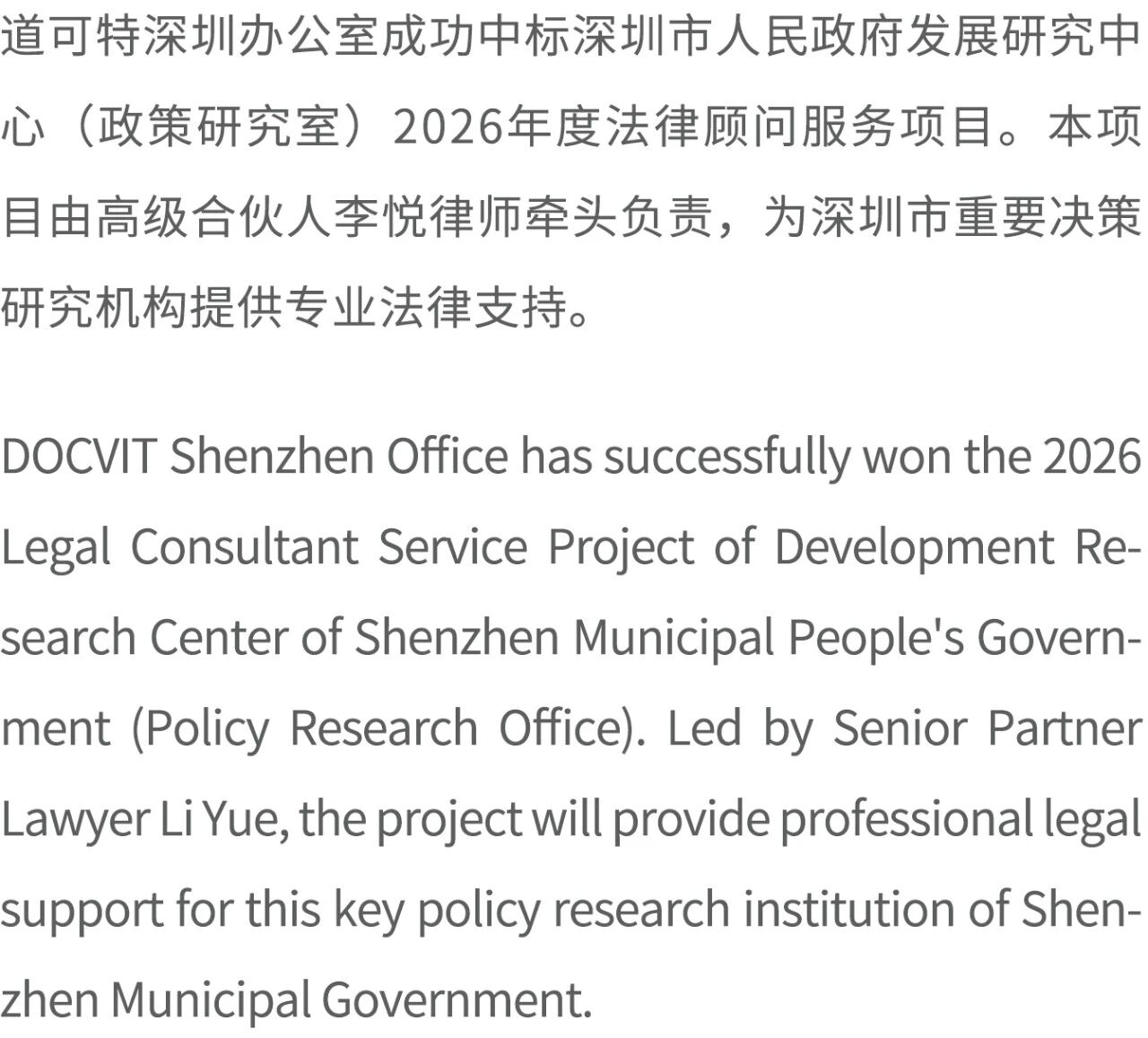 业绩 | 道可特深圳办公室中标深圳市政府发展研究中心(政策研究室)法律顾问项目