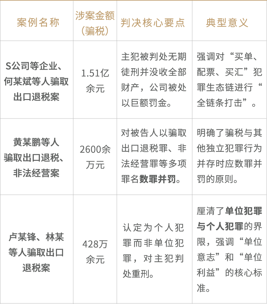 以上案例传递出明确的司法态度,即对于骗取出口退税犯罪,司法机关不仅关注核心的骗税行为,更着眼于摧毁整个犯罪网络;对于在犯罪过程中衍生出的其他犯罪行为,将依法进行全面评价和惩处;同时,在责任认定上,将严格依据事实和法律,精准区分个人责任与单位责任,确保罚当其罪。