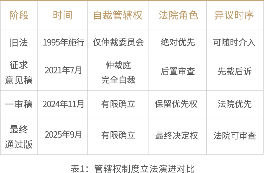 理解新法管辖权制度的设计逻辑,需首先回溯其三阶段立法进程,因为每一阶段对自裁管辖权的制度态度截然不同,直接决定了最终规则的形态。