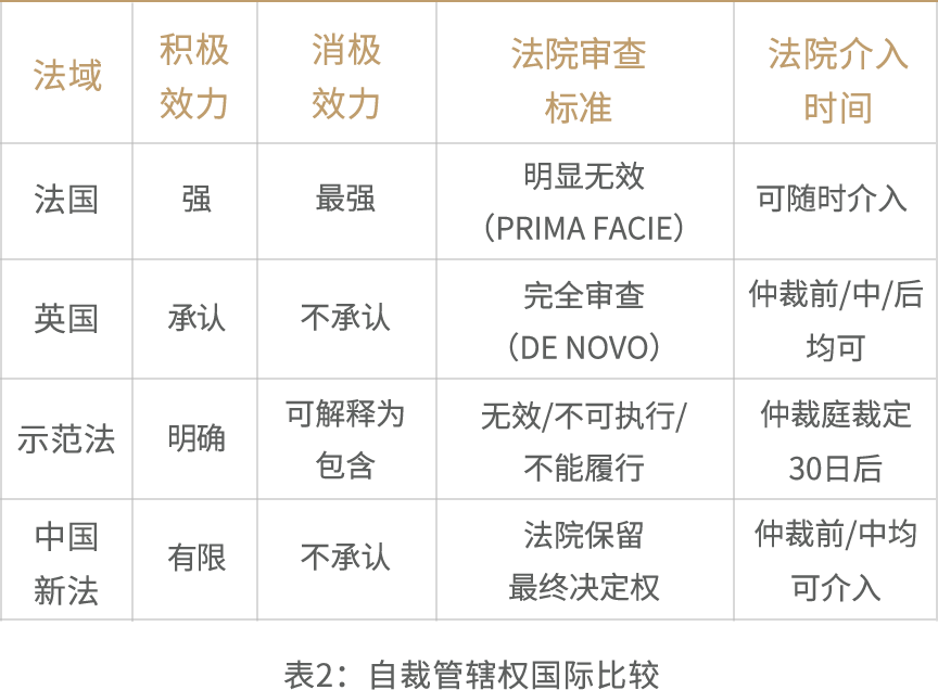 准确评价新法自裁管辖权的制度能级,需将其置于比较法坐标系中审视。自裁管辖权包含积极效力(仲裁庭有权自行裁定管辖权)与消极效力(法院在仲裁庭裁定前暂缓审查)两个维度。