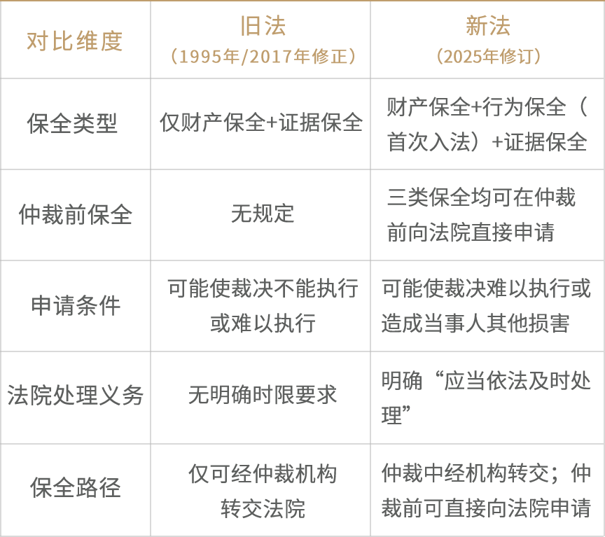 旧《仲裁法》仅在第28条规定财产保全、第46条规定证据保全,形成单一的“双轨保全”格局。新法第39条和第58条重新构建了保全制度的完整架构,实现了三个维度的根本性升级。