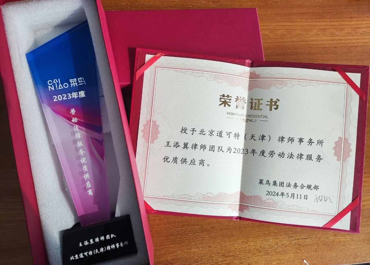 近日,道可特天津办公室合伙人王添翼律师团队被菜鸟集团法务合规部评选为“2023年度劳动法律服务优质供应商”。2023年度,王添翼律师携团队成员充分发挥在劳动人事领域的专业服务优势,为菜鸟集团提供了涉及全国多省市的劳动人事案件诉讼代理及非诉专项法律服务,其高质量的服务水平获得了菜鸟集团的充分肯定。