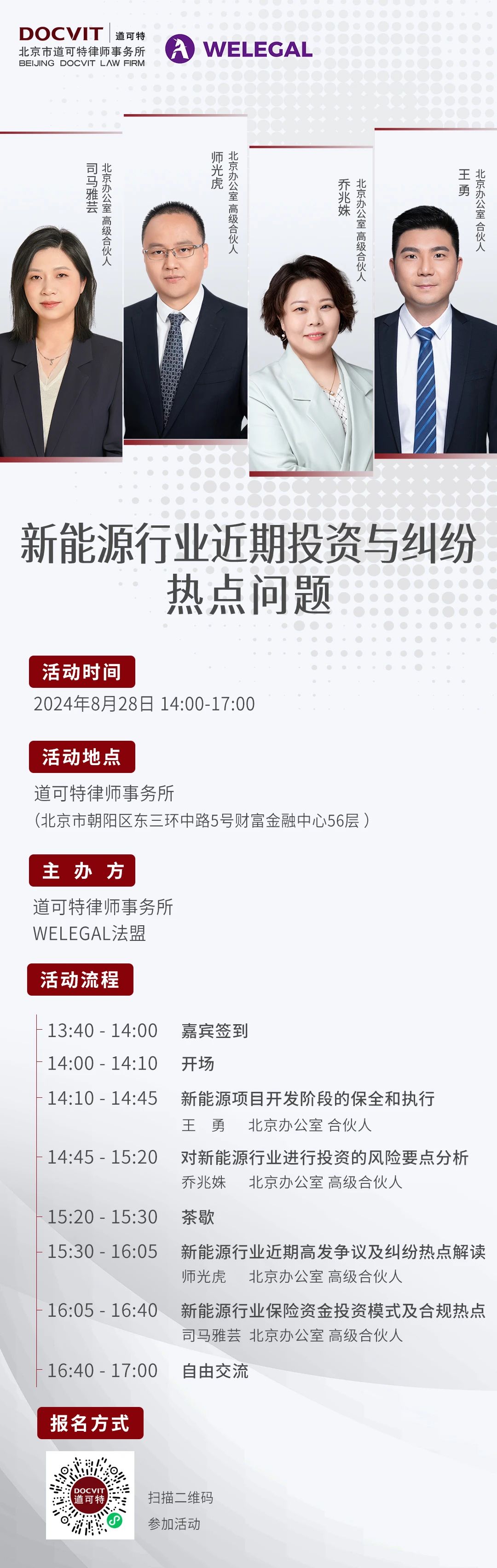 在此背景下,道可特律师事务所联合WELEGAL法盟举办“新能源重点疑难问题”闭门研讨会,希望通过各方共同探讨这些疑难法律问题,增强法律服务的针对性,为新能源产业的稳定发展提供坚实的法律保障。
