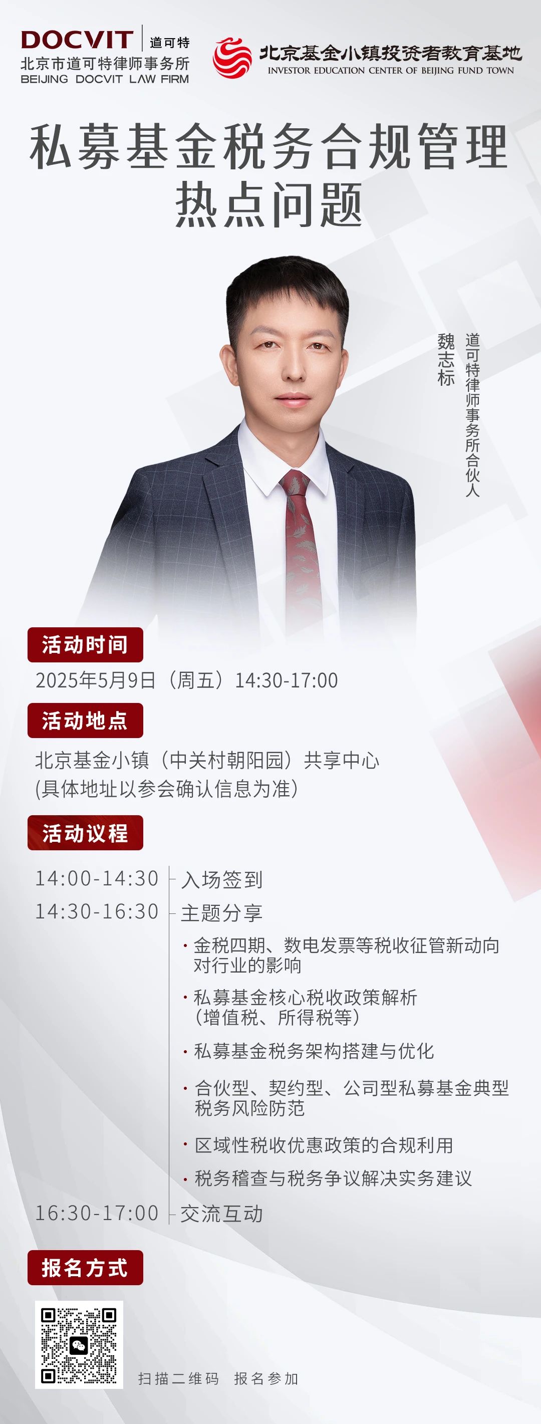 5月9日,北京基金小镇、道可特律师事务所共同举办“私募基金税务合规管理热点问题”主题分享会,道可特合伙人魏志标律师将重点讲解私募基金核心税收政策,并梳理不同组织形式基金的税务差异、优化空间以及可能涉及的税务风险,并结合最新税务稽查形势和实务案例给出专业建议。