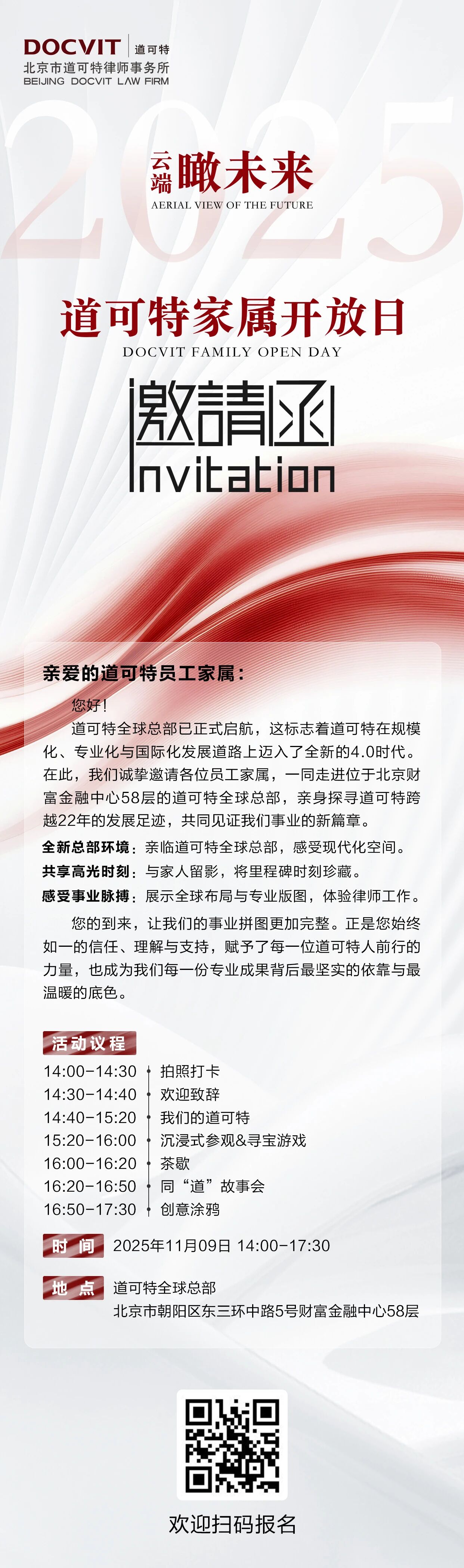 更多道可特 | DOCVIT,寓意专业卓越、不懈追求。取“DOCTOR”,作为“博士”的广博、精深、专业和“医生”的理性、负责、救治之意。一如DOCTOR所含之意,在法律服务领域,我们一直追求基于专业的无限卓越。取“VITA”,作为“生命、活力”之意,寓意强有力的道可特及其永不停止的追求。我们老、中、青携伴而行,充满活力,对创新不懈追求,对顺应时代的变革和发展充满敬畏和期待。